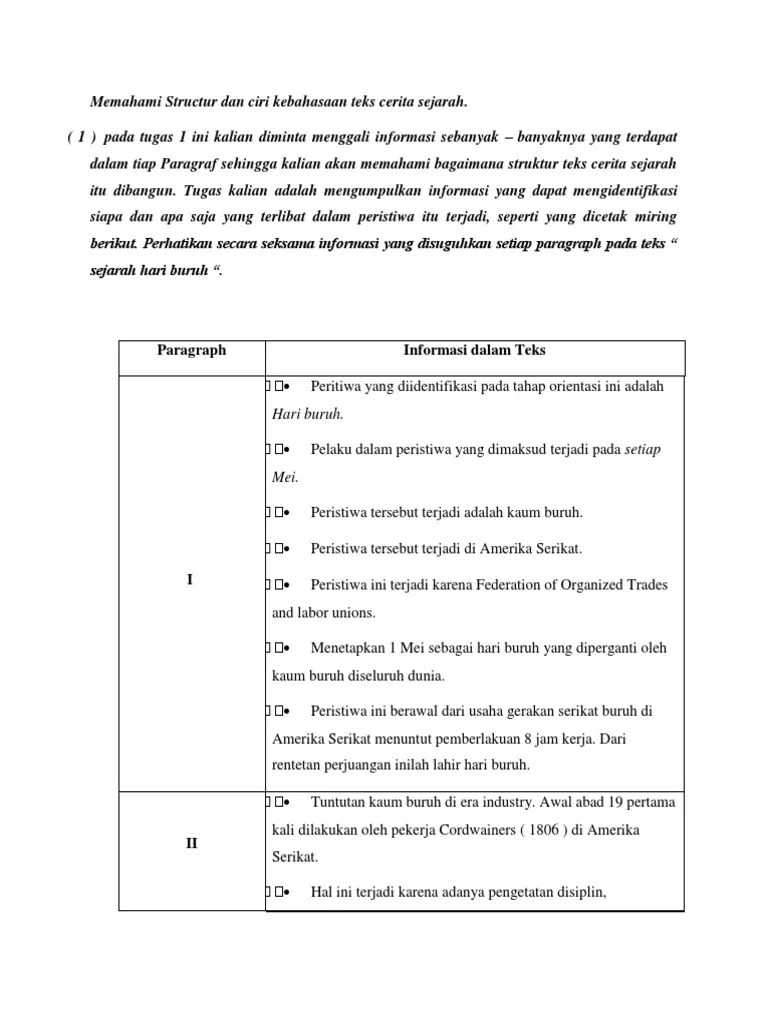 Dilansir dari teks dalam kajian struktur dan kebahasaan (2017), teks . Tugas 1 memahami struktur dan ciri kebahasaan teks cerita sejarah. Peringatan hari buruh internasional atau may day dibeberapa negara ditetapkan sebagai hari libur nasional, termasuk di indonesia. 12 kelas 12,kunci jawaban bahasa indonesia halaman 20,tugas 1 memahami . Buku teks pelajaran bahasa indonesia ditulis dengan tujuan agar siswa. Text of struktur dan ciri kebahasaan teks cerita sejarah hari buruh. Pendidikan bahasa dan sastra indonesia. Teks cerita sejarah "sejarah hari buruh". (b) untuk menguraikan urutan peristiwa . Bahasa indonesia yang telah membimbing dan memberikan pengarahan. Penanda berakhirnya bentuk kerja paksa dan perbuatan yang bersembunyi di balik hubungan industrial. Hari buruh ini lahir dari rentetan perjuangan kelas pekerja.pada 1886, terjadi demonstrasi kaum buruh amerika serikat yang menuntut pemberlakuan . Hari buruh yang dijadikan hari libur tahunan di beberapa negara, dikenal dengan sebutan may day diperingati setiap 1 mei.